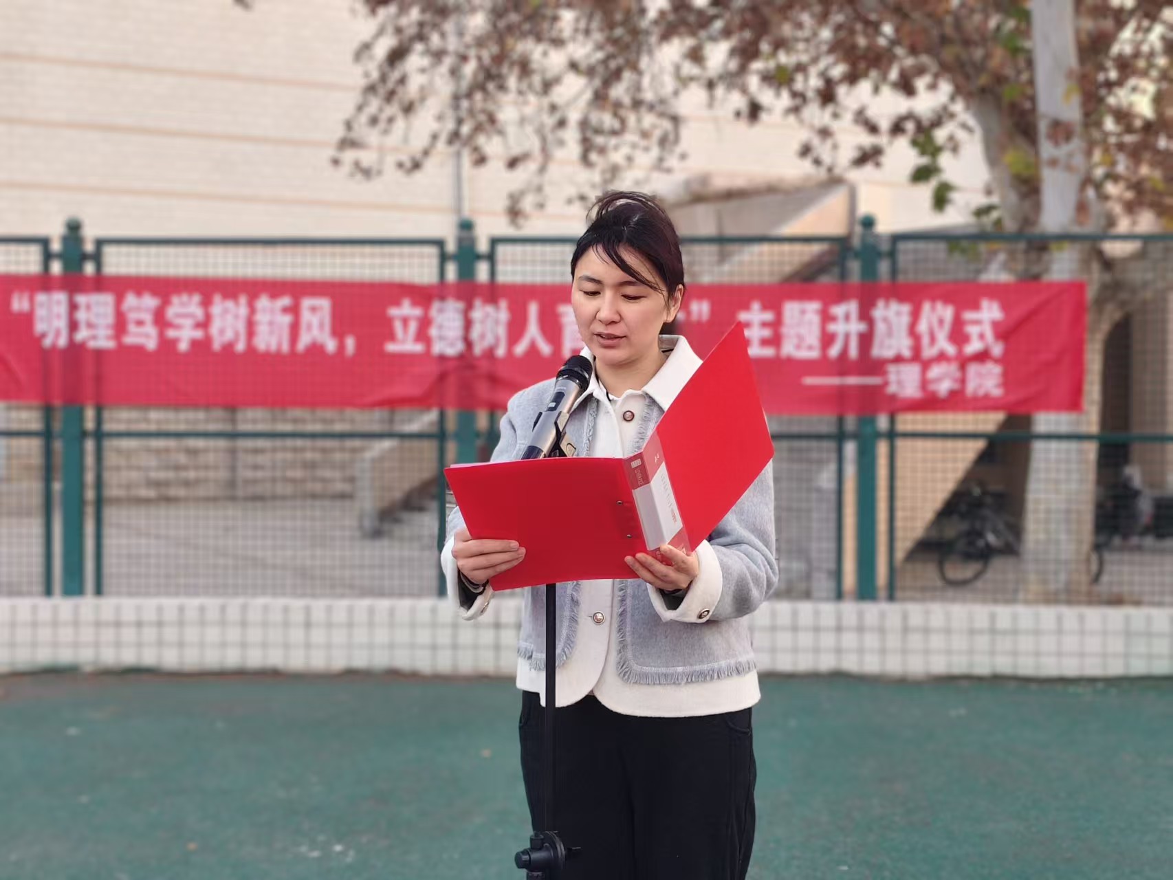 本网讯(通讯员 时祖悦 王冰怡)为弘扬优良校园风尚,传承立德树人教育理念,11月24日清晨,我院于文化路校区操场举行“明理笃学树新风,立德树人育英才”主题升旗仪式。学院领导班子、教师代表及2025级本科生参加升旗仪式。升旗仪式由院正科级组织员孙晴主持。
