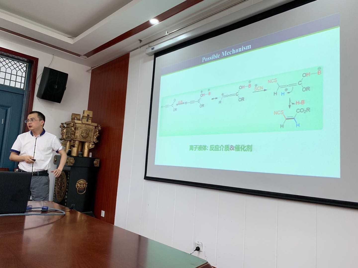 何老师报告的内容主要是:利用溶剂和化合物在反应中发挥多重作用,结合串联反应和化合物溶解度差异,减少添加剂的使用,减少反应步骤,简化产物分离提纯工艺,实现高价值化合物的绿色合成。随后在座的老师和研究生向李老师请教了绿色合成化学方面的问题,李老师进行了一一解答。随行的湖南农业大学副教授桂清文博士也进行了简短的学术交流。