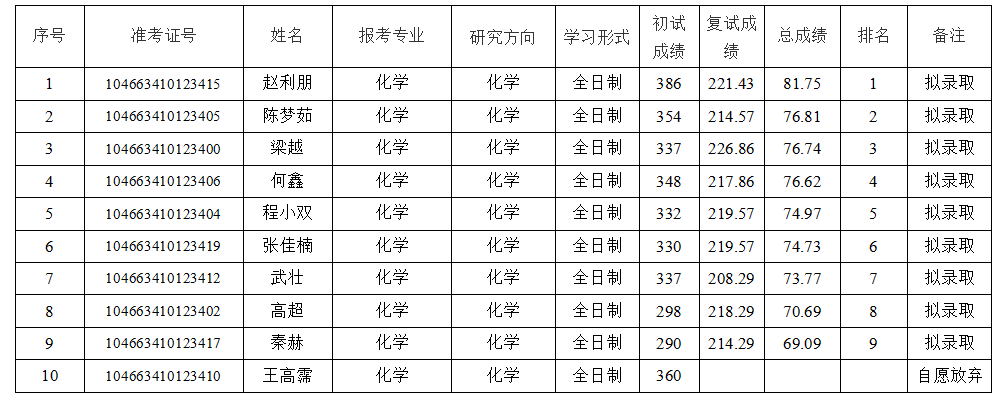 肉漫屋 化学专业2023年硕士研究生复试结果公示(一志愿)