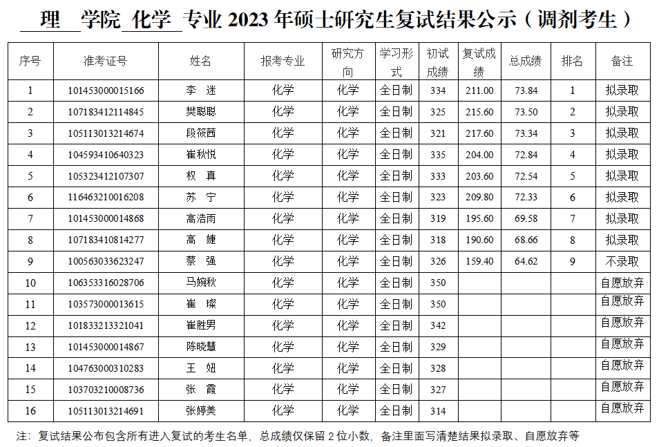 肉漫屋 化学专业2023年硕士研究生复试结果公示(调剂考生)
