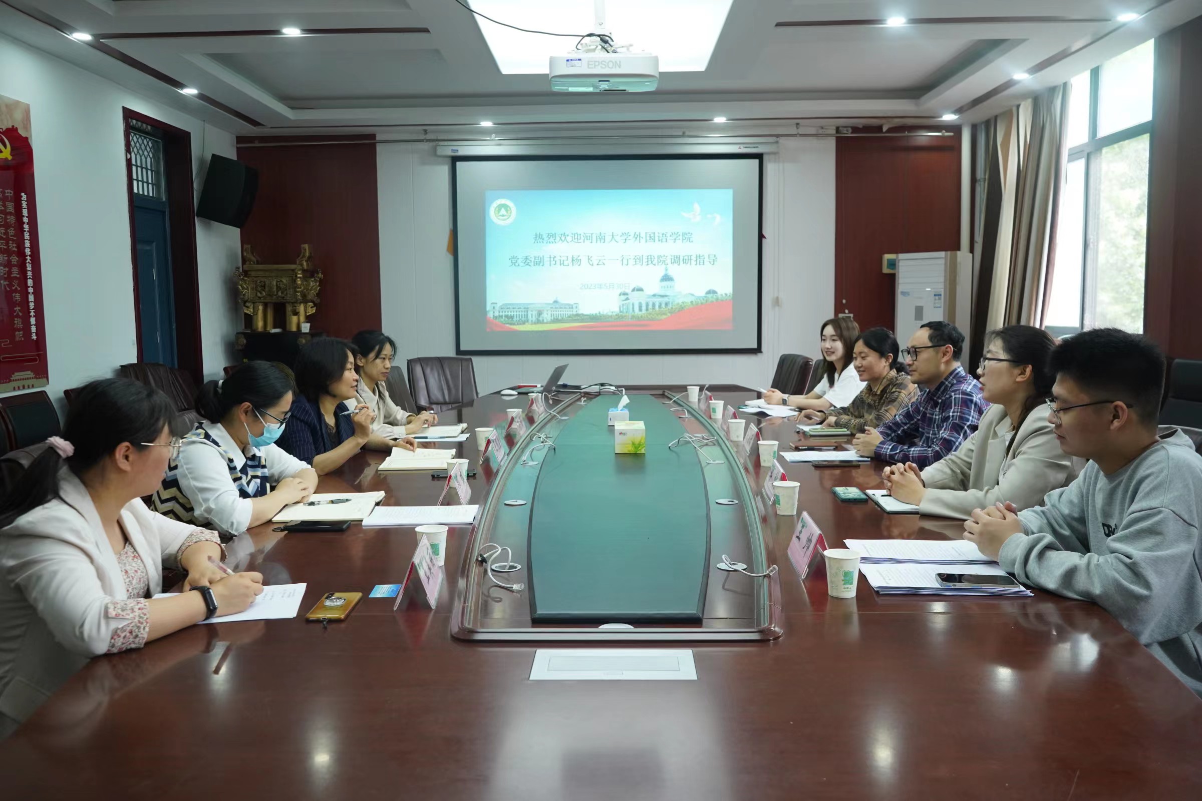 本网讯(通讯员 张爽 图片 刘兵兵) 5月30日上午,河南大学外语学院党委副书记杨飞云、团委书记田林涛一行5人来我院开展学生工作调研交流活动。肉漫屋 党委书记王照兰、党委副书记李丹、团委书记邓瑛、正科级组织员孙晴及全体辅导员参加调研座谈会。