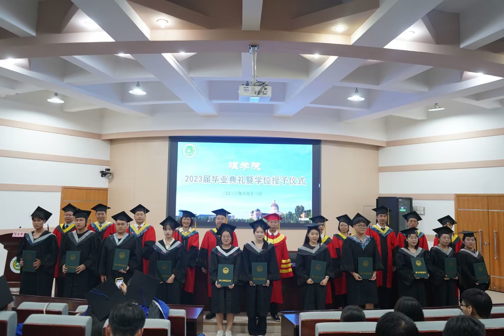 院学位委员会成员为2023届硕士、本科毕业生一一拨正流苏、颁发学位证书,并与学生合影留念。
